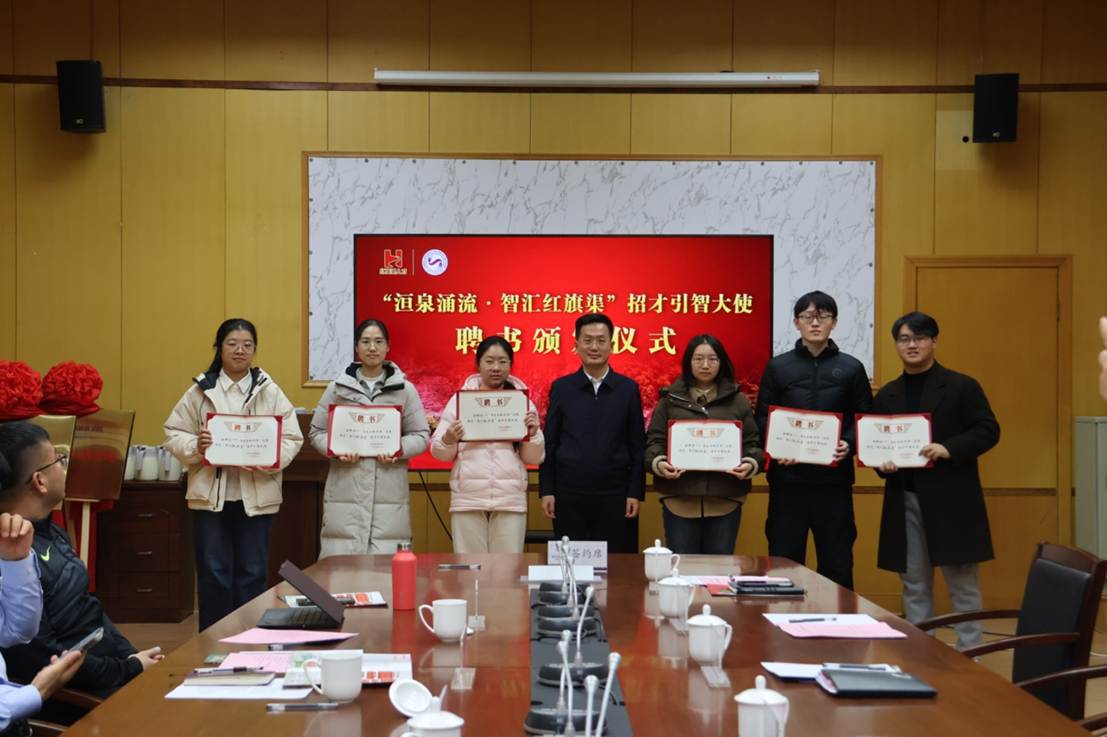 学生代表颁发《林州市“洹泉涌流・智汇红旗渠”招才引智大使》聘书。一系列务实举措标志着校地合作迈入共育共享、双向赋能的新阶段,为人才链与产业链深度融合搭建起更坚实的桥梁。